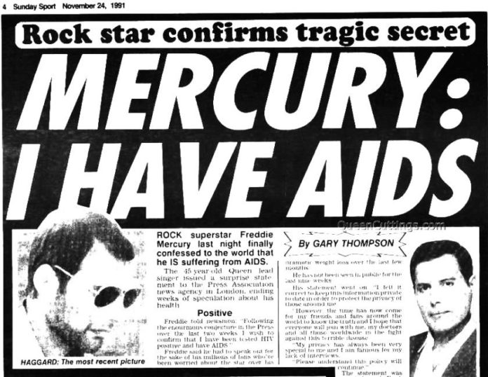 Lo annunciò venerdì 22 novembre 1991, ma la data che viene ricordata è il 23 perché la notizia fu il titolone di tutti i giornali. Freddie Mercury, dal letto della sua casa di Logan Place, a Londra, ventiquattr’ore prima di morire rilasciava questa dichiarazione: