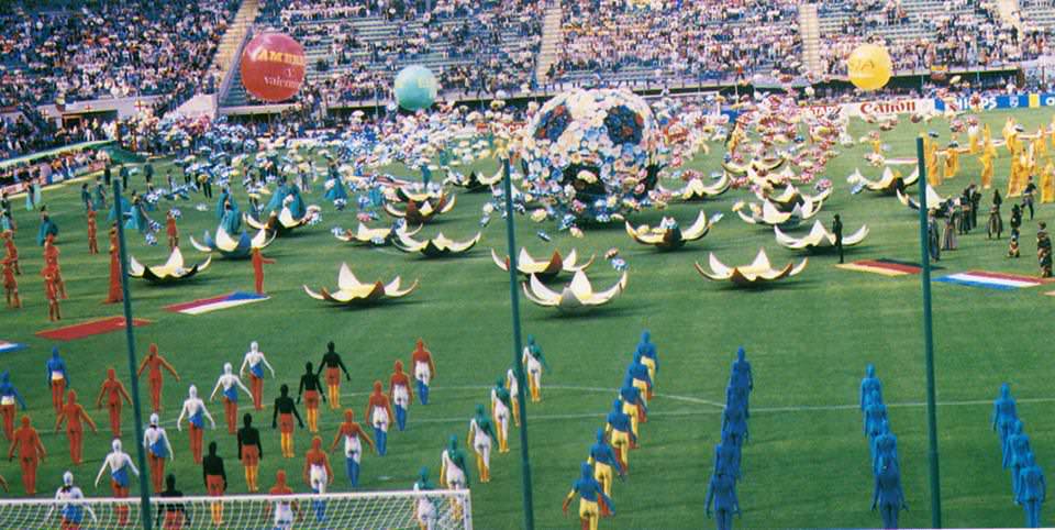 Durante la cerimonia di apertura, modelli da tutti i continenti presenti al Mondiale sfilarono con capi disegnati da alcuni grandi stilisti italiani: l’America con Valentino in rosso (il colore preferito dello stilista), l’Africa con Missoni in nero, l’Asia con Mila Schön in giallo, e l’Europa con Gianfranco Ferré in verde. Come musiche, all’inizio della cerimonia Bennato e la Nannini cantarono Un’estate italiana, poi la band Giorgio Moroder Project reinterpretò cinque brani sempre abbinati ai continenti (We Are the World di USA for Africa, Pata Pata di Miriam Makeba, Hand in Hand dei Koreana (già canzone ufficiale dei Giochi Olimpici di Seul 1988), Forbidden Colours di Ryūichi Sakamoto, e All You Need Is Love dei Beatles) per concludere con To Be Number One. Alla fine della cerimonia, fu mostrato un concerto di un’orchestra diretta da Riccardo Muti.