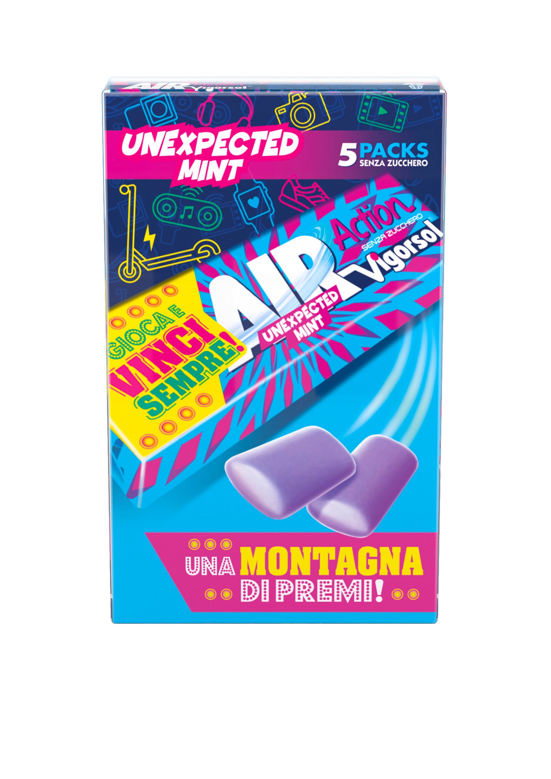 AIR Action Vigorsol – NUOVO GUSTO EDIZIONE LIMITATA UNEXPECTED MINT – Air Action Vigorsol è il chewing gum sugar free che “sprigiona un vortice di freschezza”. Oltre ai classici gusti Original e Extreme, AIR Action Vigorsol presenta la nuovissima ed irresistibile Edizione Limitata, il gusto Unexpected Mint: la super freschezza di AIR Action con una nota inaspettata.