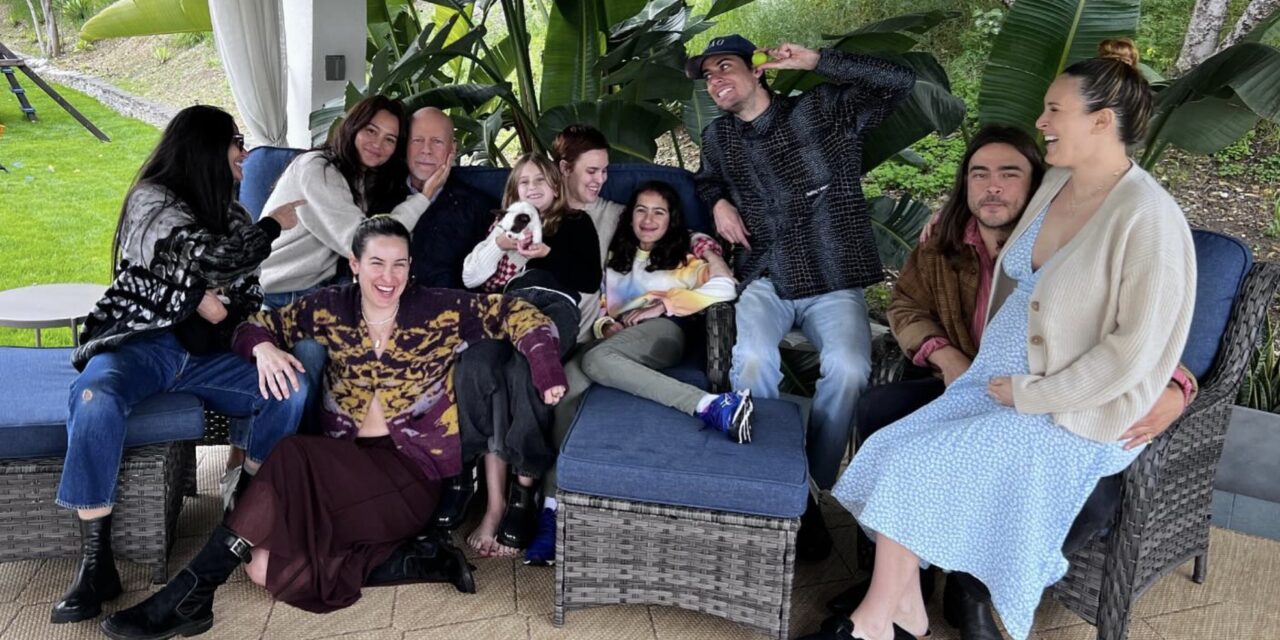 Nella foto, al centro, Bruce Willis abbracciato e accerchiato dalle figlie Mabel ed Evelyn, Demi Moore e le tre figlie avute insieme: Scout, e Tallulah e Rumer con i rispettivi compagni.