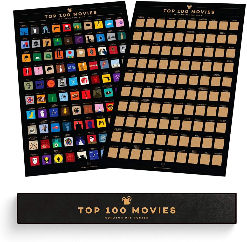 Questi simpatici poster contengono 100 quadretti con dei nomi di film famosi che qualsiasi cineasta dovrebbe vedere almeno una volta nella vita. Quando avrete visto questo film, potrete grattare via la casella e rivelare una caricatura del poster del film in questione! Un ottimo arredo per la camera da letto di qualsiasi cineasta.