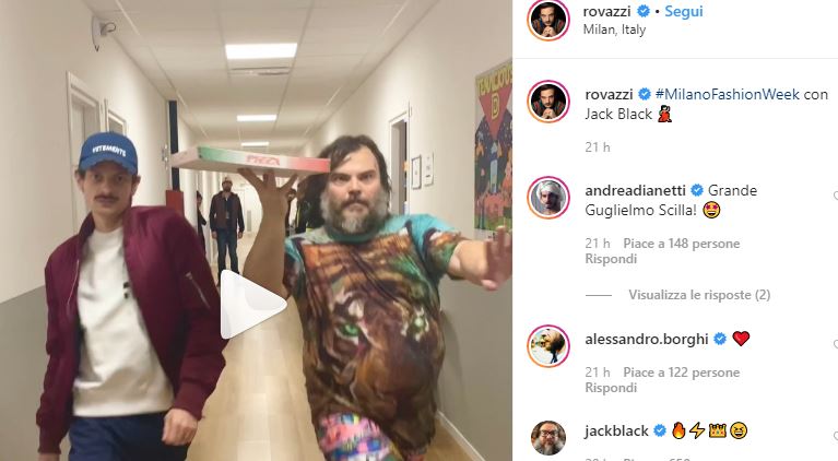 Immortalati in un video postato sui social, Rovazzi e Black sono stati protagonisti di una particolare sfilata avvenuta nell’ambito della Milano Fashion Week, ma non su una passerella. Ritrovatisi in corridoio, i due hanno finto di sfilare, con tanto di musica in sottofondo. A spiccare su tutto, l’outfit di Jack Black: T-shirt con una gigantesca tigre, pantaloncino psichedelico e ciabatte Crocs verde evidenziatore con calzino bianco. Come ciliegina, un cartone di pizza in mano.In quasi 24 ore, il video di Rovazzi ha raggiunto più di 330 mila visualizzazioni. Vediamolo: