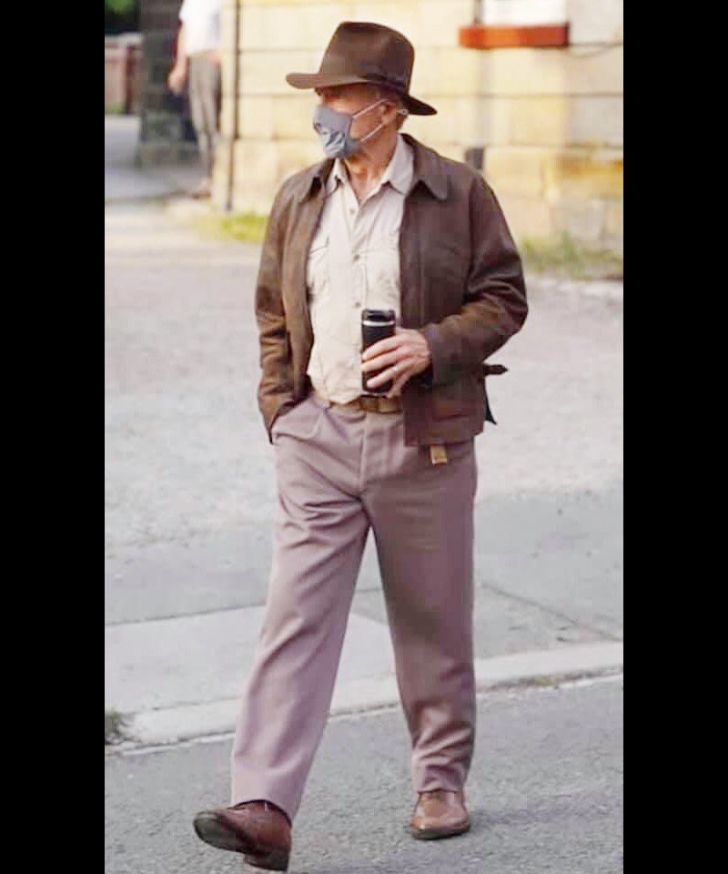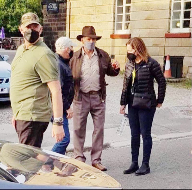 Quello nelle immagini rubate sul set che vedete in basso è proprio Harrison Ford, che si aggira nelle location in “tenuta d’ordinanza” munito di obbligatoria mascherina. Harrison conversa in alcuni scatti con Kathleen Kennedy (presidente della Lucasfilm) e suo marito Frank Marshall, producer storico della serie.