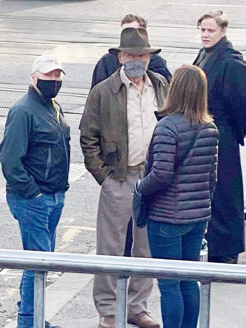 Quello nelle immagini rubate sul set che vedete in basso è proprio Harrison Ford, che si aggira nelle location in “tenuta d’ordinanza” munito di obbligatoria mascherina. Harrison conversa in alcuni scatti con Kathleen Kennedy (presidente della Lucasfilm) e suo marito Frank Marshall, producer storico della serie.
