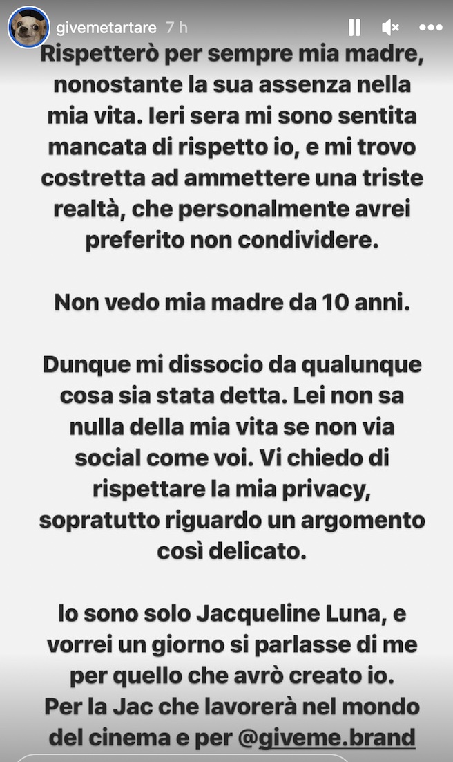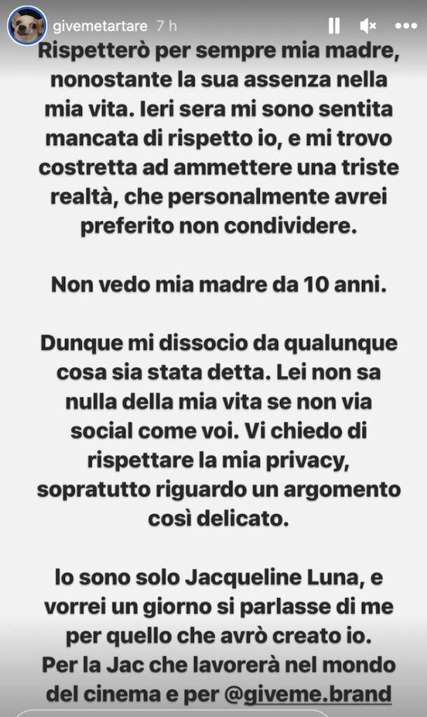 «Rispetterò per sempre mia madre, nonostante la sua assenza nella mia vita. Ieri sera mi sono sentita mancata di rispetto io, e mi trovo costretta ad ammettere una triste realtà, che personalmente avrei preferito non condividere. Non vedo mia madre da 10 anni. Dunque mi dissocio da qualunque cosa sia stata detta. Lei non sa nulla della mia vita se non via social come voi. Vi chiedo di rispettare la mia privacy, soprattutto riguardo un argomento così delicato».