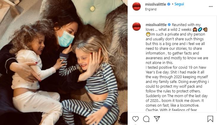 Riunita con i miei amori … che 2 settimane selvagge”, si legge nel post. “Sono risultata positivo al Covid-19 il giorno di Capodanno. Cavolo, avevo fatto di tutto nel 2020 per mantenere me e la mia famiglia al sicuro, cercando di proteggere i miei piccoli e seguire le regole per proteggere gli altri. Ma poi, improvvisamente la mattina dell’ultimo giorno del 2020… boom, mi ha preso. Ouch. E con lui sentimenti di paura, vergogna e senso di colpa che ti passano per la testa, ti chiedi da chi potresti averlo preso e chi potresti aver infettato… Terrificante. Per fortuna il resto della mia famiglia e era negativo.