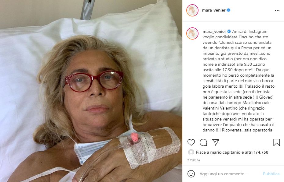 “Amici di Instagram voglio condividere l’incubo che sto vivendo: lunedì scorso sono andata da un dentista qui a Roma per un impianto già previsto da mesi… sono arrivata a studio (per ora non dico nome e indirizzo) alle 9.30 e sono uscita alle 17.30 dopo ore!!! Da quel momento ho perso completamente la sensibilità di parte del mio viso, bocca, gola, labbra, mento!”.