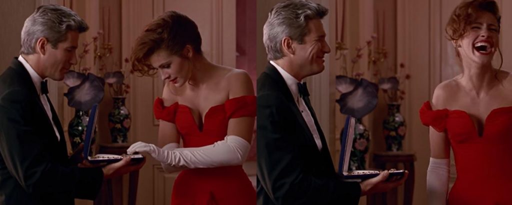 La risata e il sorriso a trentadue denti di Julia Roberts sono senza dubbio una delle sue caratteristiche più amate. C’è una scena in Pretty Woman dove questa sua qualità viene messa particolarmente in risalto, nello specifico quando Edward le consegna la collana da indossare per la serata di gala a Teatro facendo finta di chiuderle la mano dentro la custodia. Richard Gere improvvisò del tutto quel gesto, provocando una risata genuina alla Roberts. Il regista amò così tanto il risultato da lasciare l’improvvisazione.