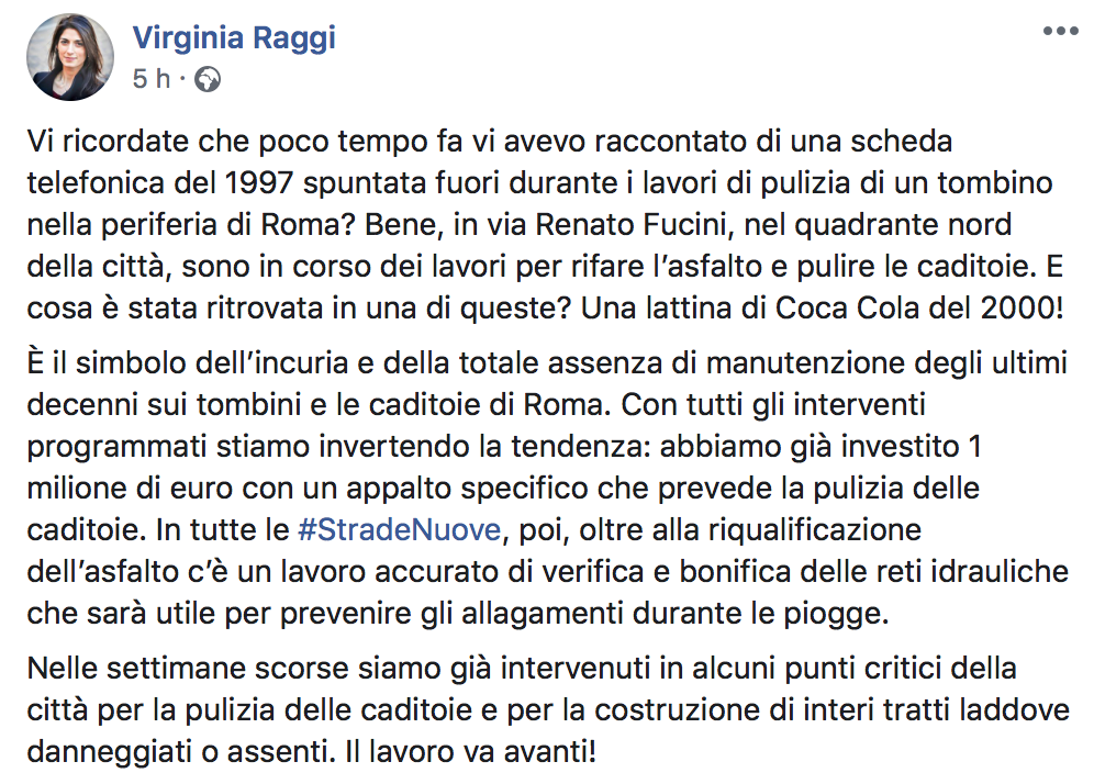 E cosa è stata ritrovata in una di queste? Una lattina di Coca Cola del 2000! È il simbolo dell’incuria e della totale assenza di manutenzione degli ultimi decenni sui tombini e le caditoie di Roma». E aggiunge: «Con tutti gli interventi programmati stiamo invertendo la tendenza: abbiamo già investito 1 milione di euro con un appalto specifico che prevede la pulizia delle caditoie». Precisiamo: la lattina di cola, aveva stampati gli auguri per il ‘Natale 2000’. Quasi agghiacciante.