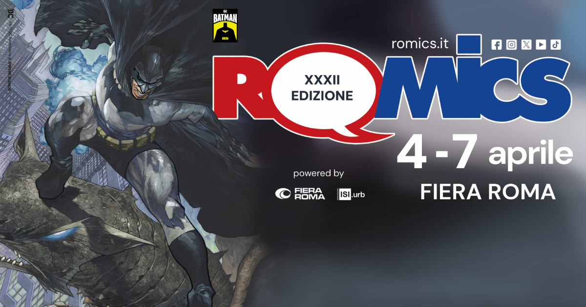 Romics, dal 4 al 7 aprile in Fiera Roma, un grande evento lungo quattro giornate pronto ad accogliere il pubblico nei 5 padiglioni con oltre 70.000 mq espositivi della Fiera. Romics è una manifestazione fieristica internazionale, certificata da ISFCERT – Istituto Certificazione Dati Statistici Fieristici, ente ufficiale riconosciuto da Accredia, con oltre 350 espositori nazionali ed internazionali, dove l’immaginario di giovani e meno giovani si sprigiona in un mix di generi e interessi attraverso molteplici percorsi di partecipazione e occasioni di confronto. Entertainment e approfondimento specialistico sono la cifra di una kermesse rivolta ad un pubblico di appassionati, professionisti e operatori del settore. A firmare il manifesto ufficiale della XXXII edizione di Romics, Simone Bianchi, Romics d’Oro dell’edizione, con un magnifico tributo a Batman in occasione dell’85° anniversario, dove il cavaliere oscuro domina il cielo con una presenza maestosa, evocando un’atmosfera di mistero e forza che ha catturato l’ammirazione di generazioni di appassionati.