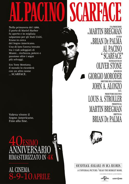 A 40 anni dalla sua uscita in Italia (era il 20 aprile 1984) torna nelle sale italiane Scarface, capolavoro scritto da Oliver Stone e diretto da Brian De Palma, con un indimenticabile Al Pacino nei panni dello spregiudicato Tony Montana e una giovanissima Michelle Pfeiffer.