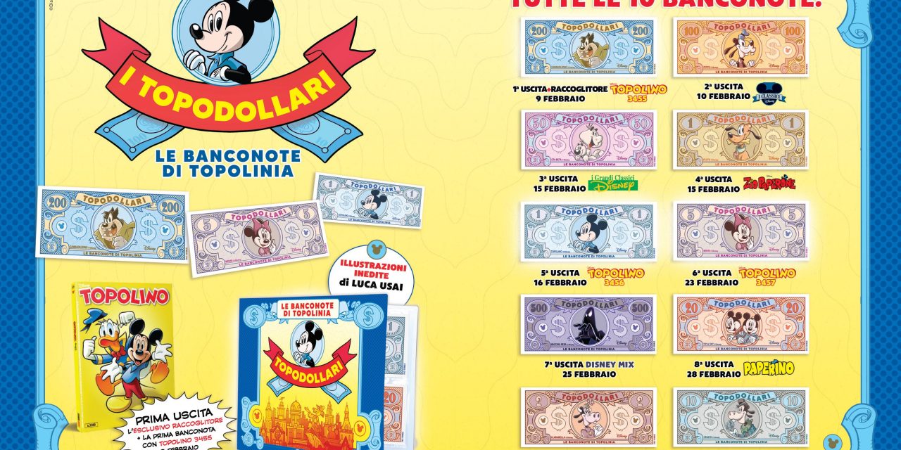 Dopo il grande successo dei Paperdollari, Topolino presenta una nuova imperdibile collezione pronta ad appassionare tutti i lettori dell’amatissimo magazine a fumetti: i Topodollari di Topolinia. 10 imperdibili banconote d’autore, nate dalla matita di Luca Usai, disponibili a partire da mercoledì 9 febbraio insieme a Topolino 3455. La collezione proseguirà poi su Topolino 3456 e 3457 e sui periodici Panini Disney, tutti in edicola, fumetteria e su Panini.it tra febbraio e marzo. Il calendario completo delle uscite è su Topolino.it.