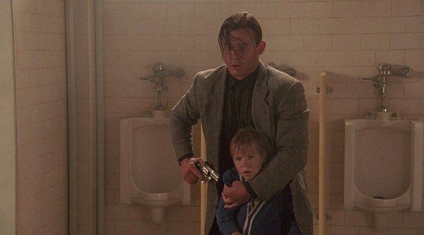 Fin dai primi minuti del film capiamo che John Kimble è un poliziotto super preso dal lavoro e immerso a capofitto nelle indagini (barbetta incolta, look sbarazzino e niente più famiglia). Ma ci vien da chiederci… è effettivamente un buon poliziotto? Da quello che ci fanno vedere prima del trasferimento ad Astoria non si direbbe proprio! In una delle scene iniziali Kimble ammanetta una testimone al braccio del suo fidanzato morto, la minaccia e poi la segue, presentandosi ad una festa e mettendosi a sparare a destra e a manca senza alcun motivo preciso, rischiando di ferire gli altri presenti. Insomma, un po’ troppo per uno che sta cercando di estorcere giusto qualche informazione, o no?