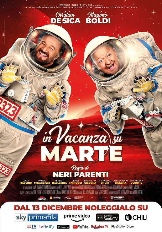 Dal 13 Dicembre arriva “In vacanza su Marte”, sarà disponibile in noleggio e acquisto sulle piattaforme digitali: Sky Primafila, Amazon Prime Video, Apple Tv, Chili, Timvision, Infinity, Google Play, YouTube, Rakuten Tv e PlayStation Store. La pellicola di Neri Parenti è ambientata nel 2030 su Marte e ci racconta le vicende di Fabio (interpretato da Christian De Sica) che, dopo aver fatto perdere le sue tracce alla moglie e al figlio Giulio, si sta per risposare. Ma durante un viaggio nello spazio, Giulio subisce una trasformazione, diventando molto più grande (personaggio interpretato da Massimo Boldi). Cosa succederà?